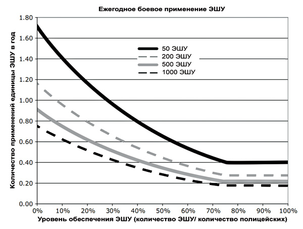 Например (см. рис.24.1), в городе, где небольшое число ЭШУ, которые выданы подразделению SWAT, каждое устройство будет часто браться на задание и использоваться в среднем 1,7 раз в год. Чем больше полицейских владеют электрошоковым оружием, тем ниже число их применения, которое равняется 0,2-0,4 в год в зависимости от числа ЭШУ в отделении полиции.
