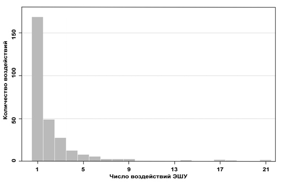 Следует отметить, что поставка ЭШУ на вооружение повлияло на изменение числа полученных травм правонарушителями (64+/-11% снижение числа травм) и полицейскими (снижение 63+/-8% ) одинаково.