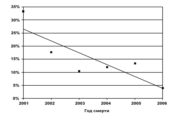 Рис. 24.6. Частота, с которой мед.эксперты называли ЭШУ возможной причиной смерти, значительно снизился со временем